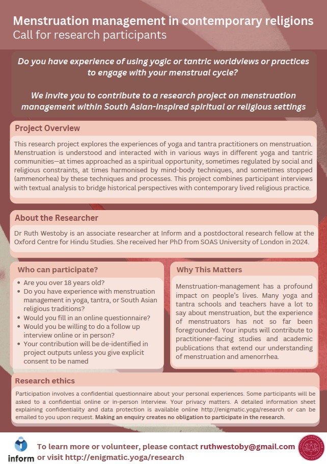 This research project explores the experiences of yoga and tantra practitioners on menstruation. Menstruation is understood and interacted with in various ways in different yoga and tantric communities—at times approached as a spiritual opportunity, sometimes regulated by social and religious constraints, at times harmonised by mind-body techniques, and sometimes stopped (amenorrhea) by these techniques and processes. This project combines participant interviews with textual analysis to bridge historical perspectives with contemporary lived religious practice.